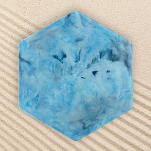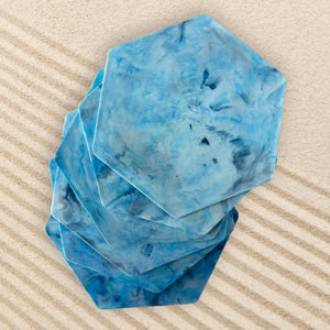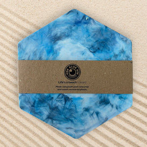 Set your drinks down in style with this 6-pack of ocean blue hexagonal coasters—crafted from 100% recycled plastic, each one unique and planet-friendly.
